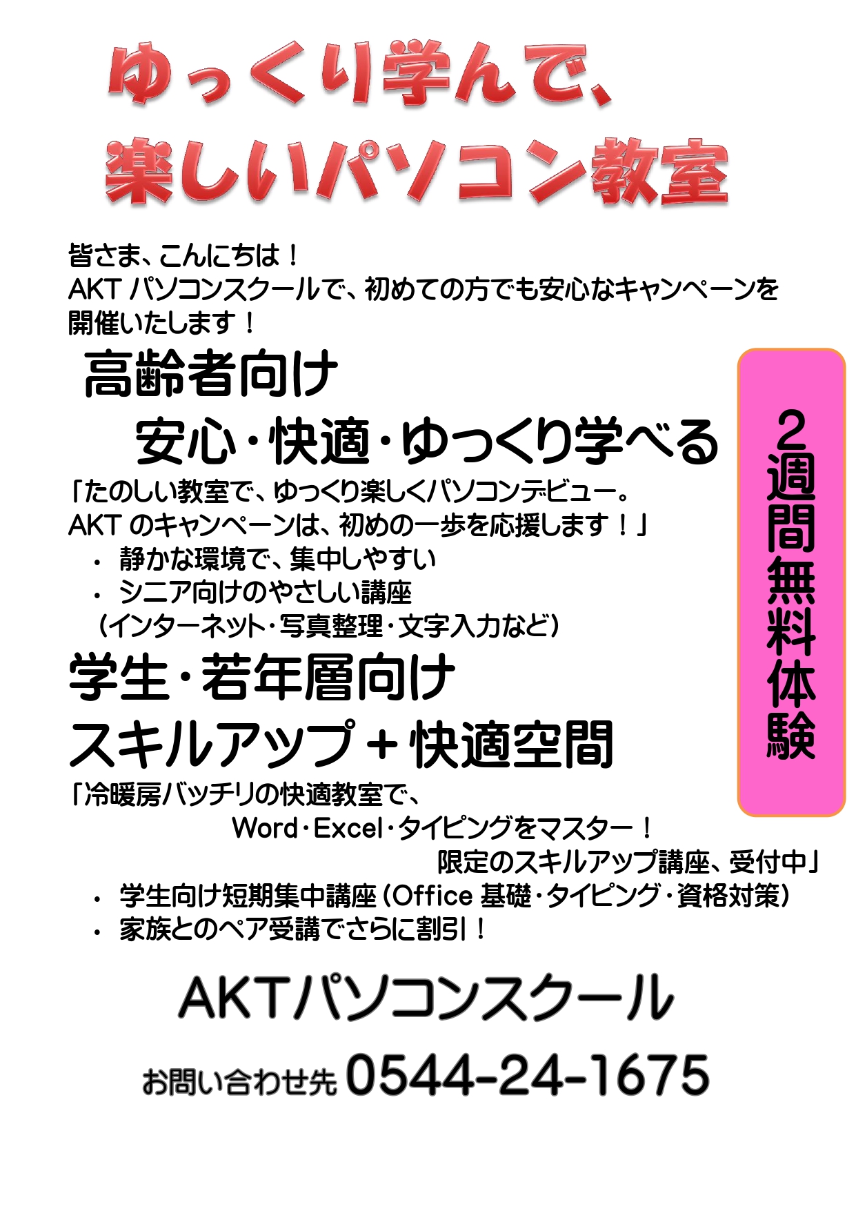 AKTパソコンスクールは富士宮市中心部、浅間大社近くのパソコン教室です。